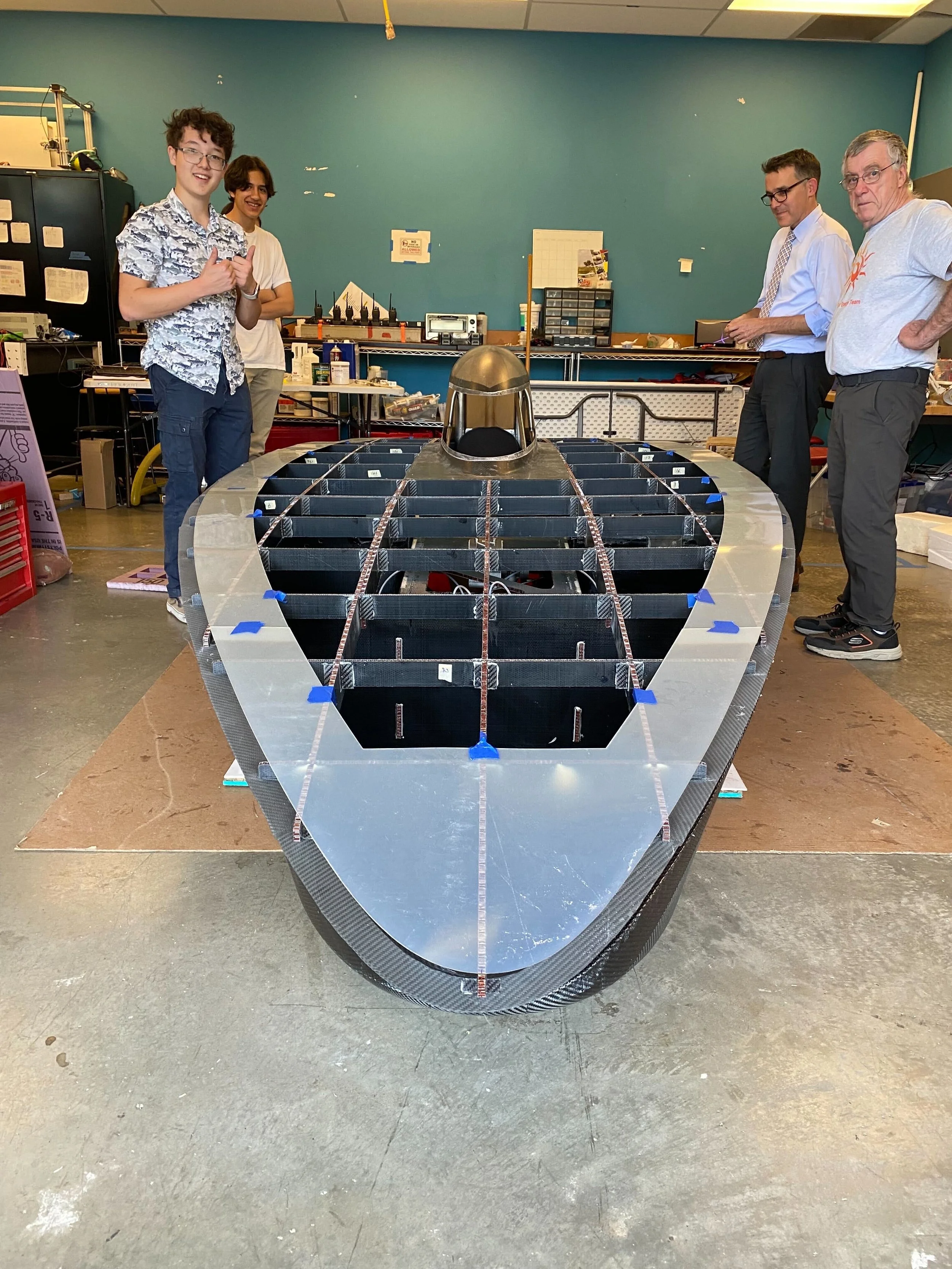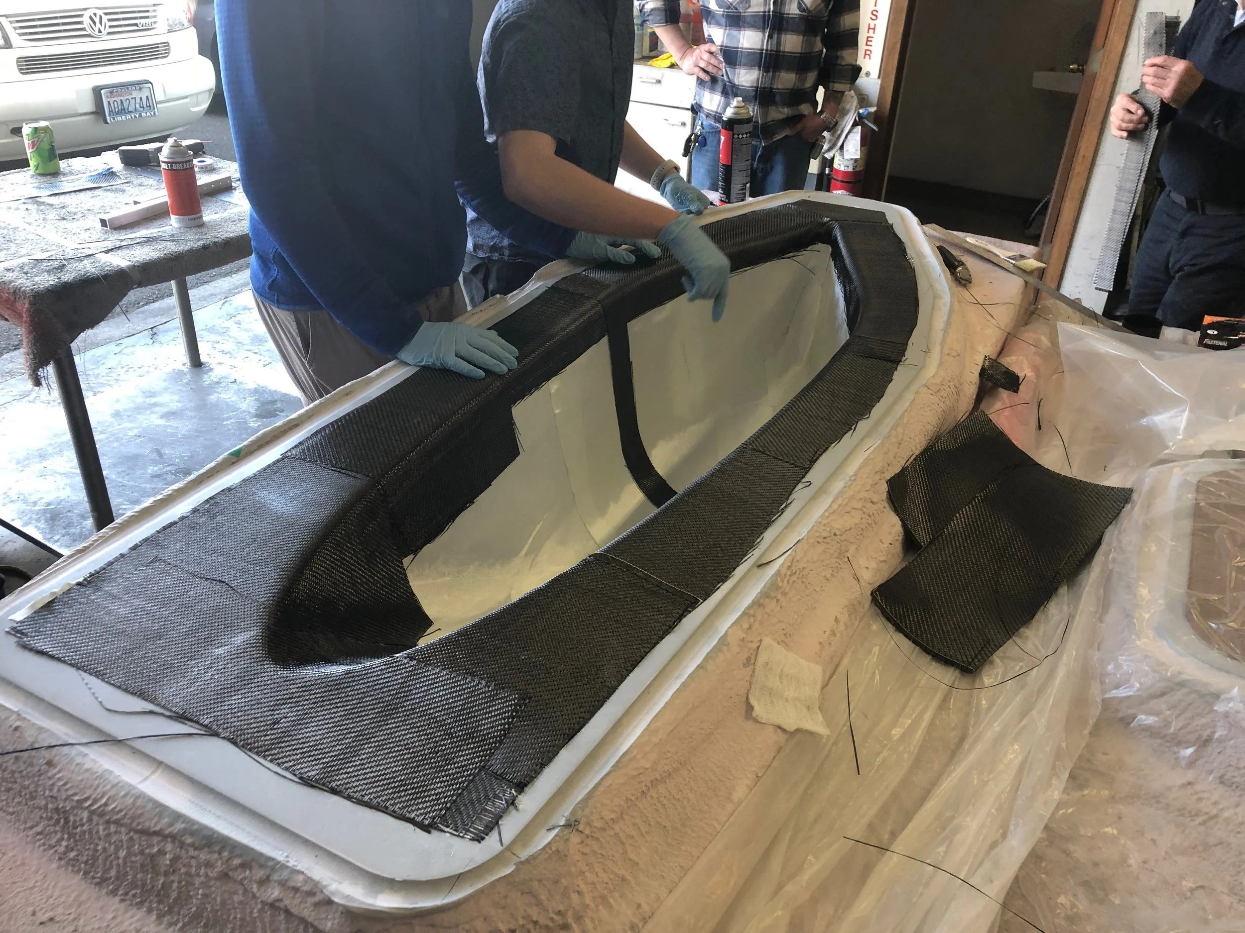 As winter progressed, we made more progress on mechanical systems, but perhaps most importantly, the aeroshell. The Sockeye aeroshell was a prepreg carbon fiber molded aeroshell, made on a custom mold generously subsidized by Janicki Industries. The mechanical team got to work sanding and prepping the mold for the layup. Meanwhile as winter turned to spring, the electrical team manufactured the solar array, with extra care due to the reduced size of the array, and the exceedingly intricate telemetry system was programmed and troubleshooted. As we closed in on the final product, it was almost time to ship the car down to Texas, and testing became a regular occurrence as we tried to nail down problems and get an idea of how the car ran.