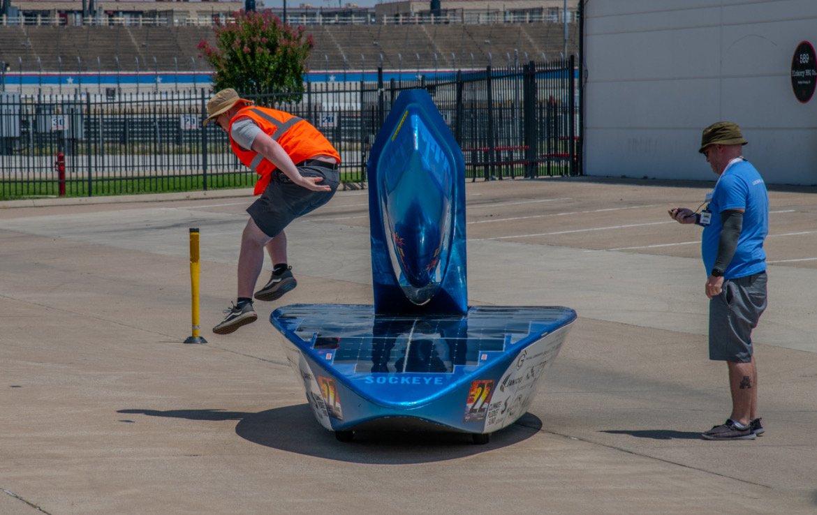 Day 4, the final day, was just as we’d hoped and planned for: completely overcast. We had the lead, and without sun to power the larger cars, we also had an advantage heading into the day with the smaller and more efficient Sockeye. While we started out conservative in our pace, as the day went on we upped our pace as we had more than 50% battery left with an hour and a half before the early cutoff due to expected rain. Coming into the pit at the end, we did it. We had completed the race, and won the division, with less than half of the allowed solar area.
