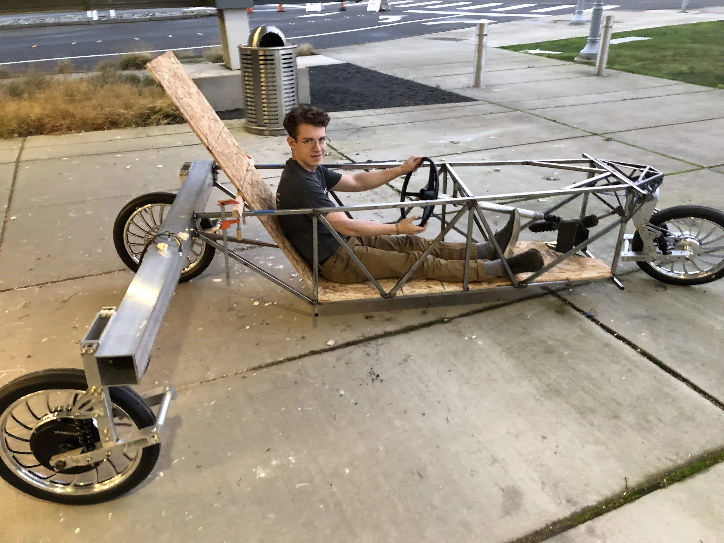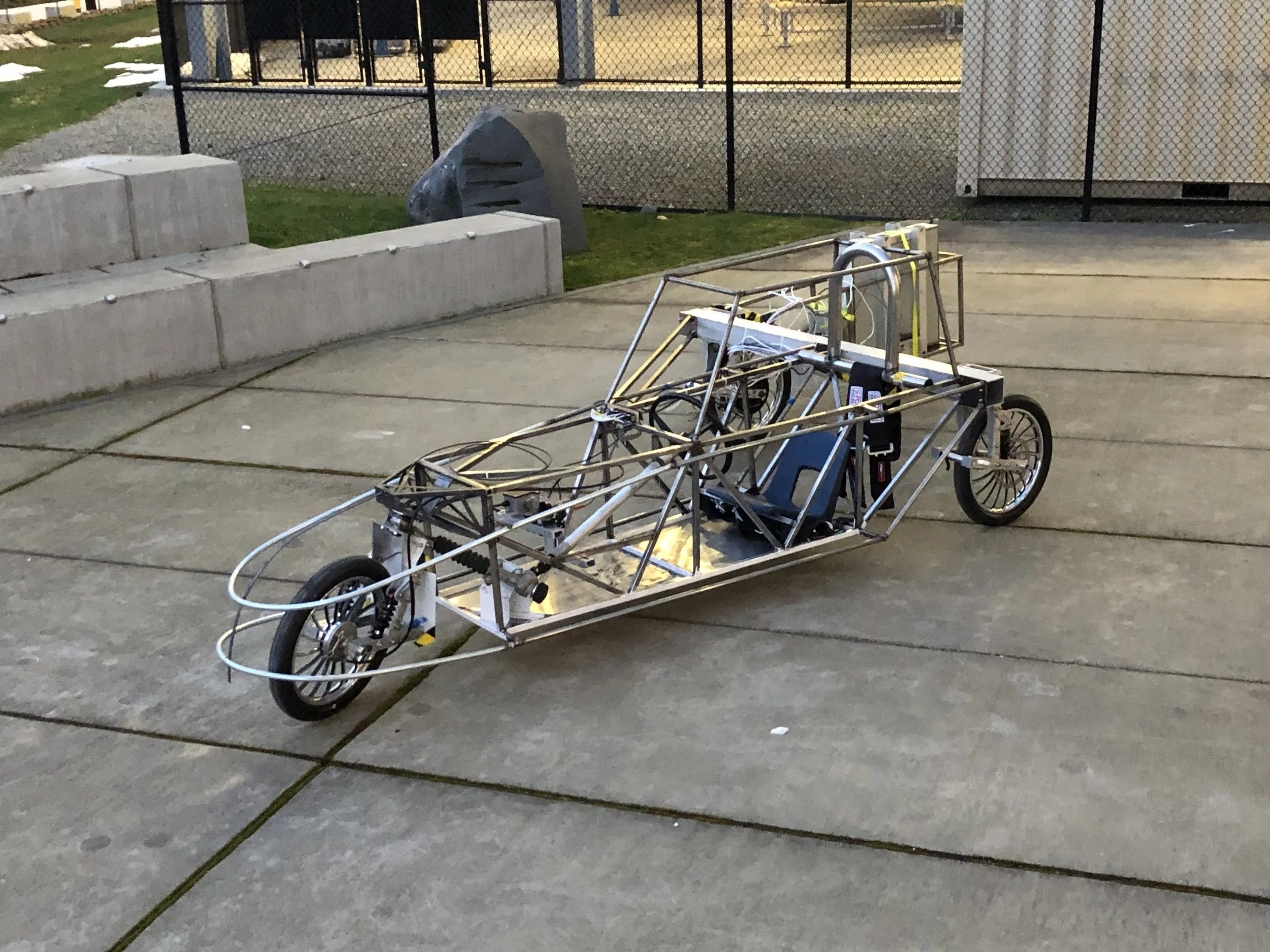 In order to reduce the complexity of a steering system, we opted for an unusual wheel configuration, most similar to the Delta configuration (1 wheel in front, 2 in back), but this one had the front wheel offset to the side as well. This led to a decently aerodynamic structure, but also had weight and balance issues solved through placing the motor and the battery as far back as possible.