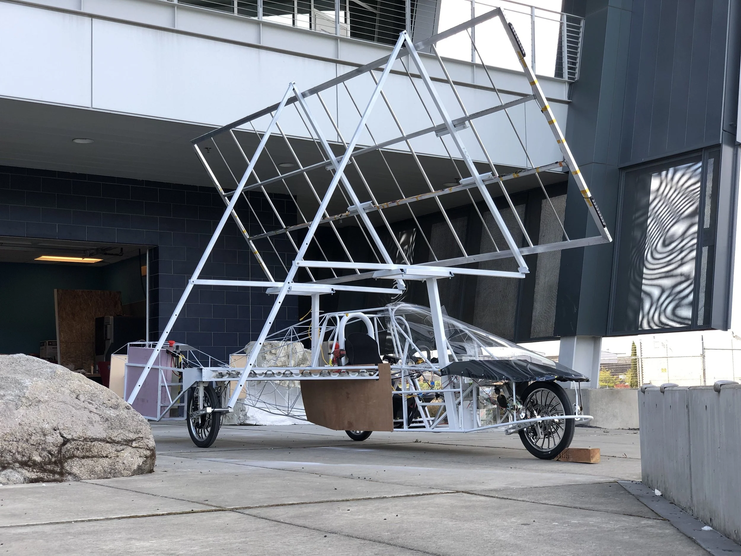 By January 2019, we had started to build our first car. Using steel tubing we started welding together a frame that was inspired by a motorcycle with a sidepod. As far as solar car design goes, it was a rather weird design: one steering wheel in front, two wheels in the rear, with an array over it. The main goal with this design was simplicity. The methods used upped the speed of building in order to get to testing and verification quickly.