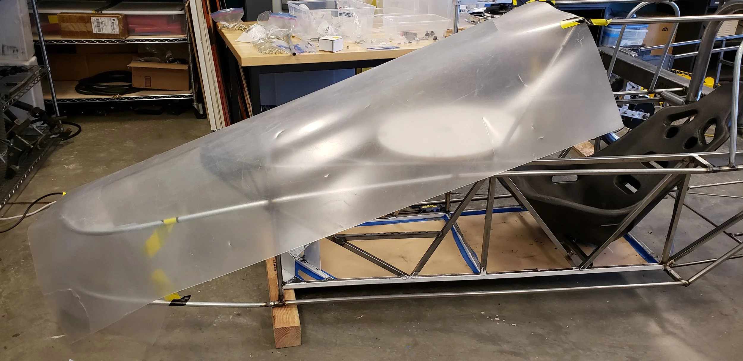 The aerodynamic elements of this car were built using a material called airplane fabric, stretched around the steel chassis. Chosen due to low complexity and low cost, this was a good option for us during our first year. Wood was used as side panels on the straight sections as to reduce costs even further.